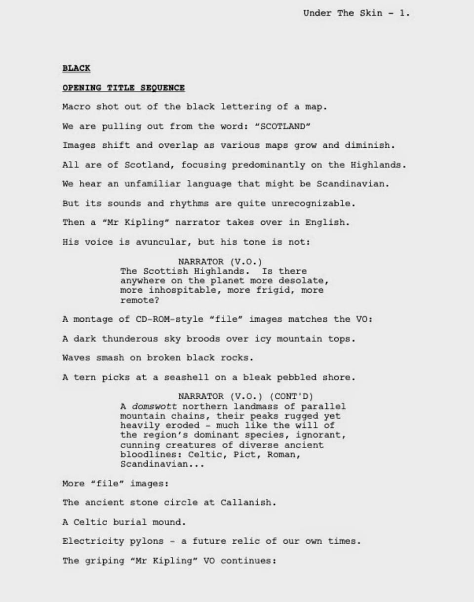The film Jonathan finally created is both different from and true to the spirit of what we were exploring: an alien view of humanity, rather than a human view of aliens. It is wonderfully bleak, mysterious, hypnotic and unforgettable. The scenes of Scarlett Johansson seducing her prey — seduce doesn’t seem an adequate word, what happens is far stranger and more indelible than that — are among the most haunting images I’ve seen on film in a long time. The way in which Jon shot the film was unique, too, having Scarlett drive around Glasgow in a van picking up, in many cases, real hitchhikers — and using the hidden-camera footage only after signed releases had been obtained from her unwitting passengers (the releases were not always forthcoming). Please watch the film. It’s a work that will endure, I believe, and not because I had any part in it at all. Some films have to be made. Under The Skin was one. It’s like nothing else. It enters the bloodstream. There is no antivirus.